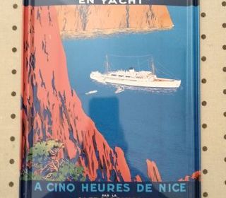 Ah ! La Corse, en yacht en plus, et pour finir avec les célèbres croisières Fraissinet. Embarquement à Nice. Plaque en acier et en excellent état. Hauteur 21 cm. Largeur 15 cm.