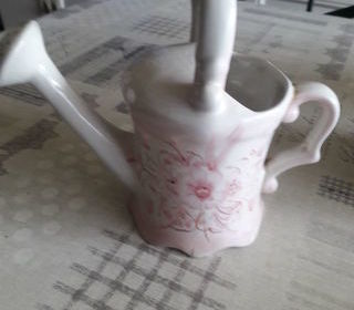 Arrosoir en faïence motif floral rose sur fond blanc Pour décoration ou collection Hauteur 21,5 cm , diamètre 11cm Bon état