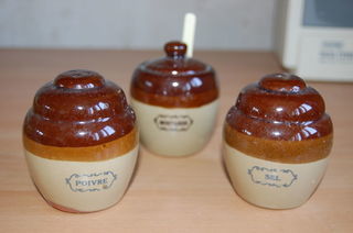 Salière, poivrière et moutardier style ancien diamètre approximatif : 6,5 cm hauteur approximative : 6 cm