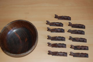 11 porte-couteaux en bois sculpté dimensions : 4 cm de long 1,5 cm de large donne 1 bol en bois dimensions : diamètre dessus : 13 cm diamètre dessous : 8 cm hauteur : 5