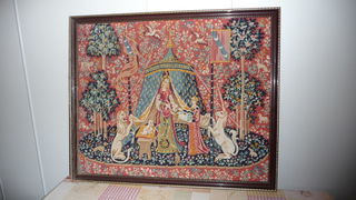 beau tableau canevas " dame à la licorne" très bon état dimensions: canevas: 79x64cm encadrement:84x69cm à refaire