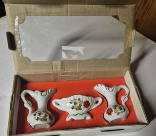 ensemble+vintage+Le+Cottage+Rose+composé+de+trois+pièces+miniatures+en+porcelaine+décorées+de+fleurs+:+deux+petits+pichets+de+8+cm+de+hauteur+chacun+et+une+mini+saucière+de+5+cm+de