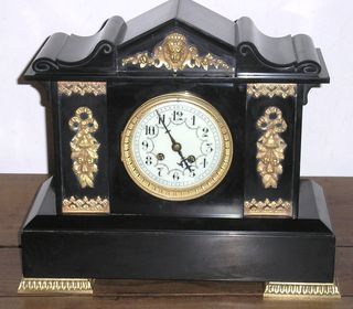 Pendule à poser en marbre noir, réhaussée de dorures et bronze Hauteur : 32 cm Largeur : 49 cm Diamètre du cadran : 123 cm Mouvement (révisé) avec sonnerie 1/2 heures et heures