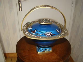 Ancienne bonbonnière - Israël vintage Bonbonnière émaillée bleu avec anse et couvercle estampillée Made in Israël, On peut lire sur le couvercle l'inscription Israël (en anglais