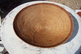 Grande corbeille ronde en rotin Ø 57 cm avec motifs géométriques La corbeille est légèrement évasée Dimensions : Diamètre : 57 cm Hauteur : 13,5 cm en très bon état P
