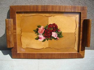Ancien grand plateau de service - Années 1920 encadrement en bois et fond en marqueterie sous-verre Le décor de roses est peint à la main Dimensions : Longueur (sans l