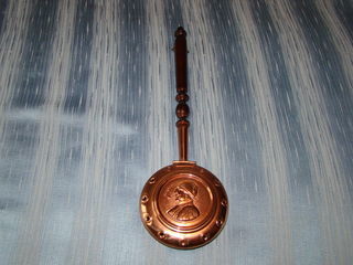 Ancienne bassinoire en cuivre décorative Villedieu - années 1960 avec manche en bois avec couvercle en cuivre qui s'ouvre Décor : Normand en costume traditionnel estampillé : E