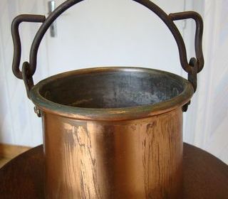 Ancien petit chaudron en cuivre années 1940 avec anse en fer forgé Dimensions : Hauteur (sans l'anse) :10,5 cm Diamètre intérieur : 11,3 cm Pour décoration / cache-pot ou ja