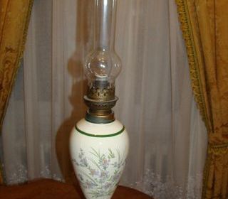 Ancienne grande lampe à pétrole toupie en faïence à décor floral Hauteur : 62 cm En très bon état A venir chercher sur place Règlement en espèces