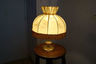 Lampe de chevet vintage - années 1960 pied en métal doré avec son abat-jour d'époque en satin et passementerie Hauteur : 34 cm En bon état. Elle fonctionne. (ampoule non f