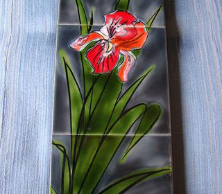 Tableau en céramique émaillée La Roue Vallauris - années 1960 Décor à l'iris signé La Roue Vallauris Tableau composé de 3 carreaux en céramique émaillée sur panneau en bois Ha