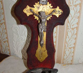 Ancien bénitier crucifix de chevet - Epoque Napoléon III circa 1860 Crucifix Second Empire ? XIXème en bois recouvert de velours rouge avec croix lancéolé en laiton et Christ