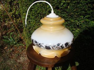Suspension en opaline vintage - années 1970 en opaline orange et blanche à décor floral Hauteur : 19 cm Diamètre de l'ouverture : 20 cm En bon état A venir chercher su