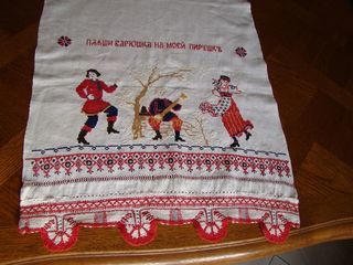 Ancien chemin de table russe brodé main - Epoque 1900 Broderie russe entièrement fait main représentant un joueur de balalaïka, avec une danseuse et un danseur en costume tradi