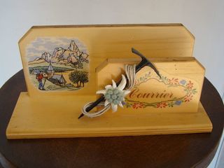 Ancien porte-courrier en bois (déco montagne) vintage années 1960 Porte-lettres avec décor de piolet avec sa corde et un edelweiss Sur le panneau du fond, un randonneur en montag