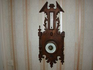 Ancien baromètre / thermomètre en bois sculpté Epoque Napoléon III Baromètre anéroïde et thermomètre XIXème à décor de balustres, feuillage et toupies Le thermomètre est au m