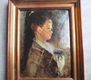 Émaux de Limoges Portrait d'une fille au bouquet Cadre doré Dimensions cadre : 25,5 x 31,5 cm, Epaisseur 2,3 cm Dimensions émail : 18 x 23,5 cm Très bon état