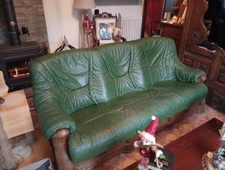 Donne canapé cuir vert et bois état satisfaisant non convertible pouvant encore relaxer quelqu'un ! Muni de 3 tiroirs en bas en facade. Pas de livraison, à retirer sur place.
