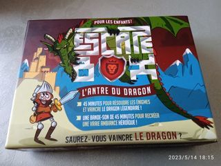je vends jeu escape box : Frédéric Dorne - "l'Antre du Dragon" très peu servi temps : 45 minutes 2 à 5 chevaliers 8 à 12 ans 1 adulte maître du jeu 1 livret 32 pages 40