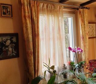 double rideaux doublés pour fenêtre avec leurs embrases Hauteur 187,largeur en haut 66, 130 en bas 40 € voilage assorti hauteur 165, largeur haut 182, largeur bas 370. 35 €