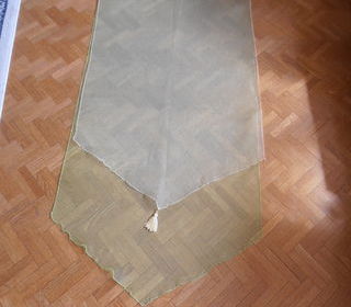 Très jolie paire de rideaux double, en voile, en dégradé de vert, finition en pointe, celui du dessus est terminé par une pampille assortie, dimensions : 120 cm x 60 cm. E