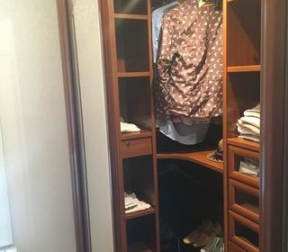 Dressing d'angle couleur wengé - poignées et baguettes couleur argent - très bon état dimensions : - angle 91 cm x 91 cm - 2 penderies de 100 cm - 1 penderie de 50 cm - Haute