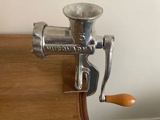 Hachoir à viande manuel ancien en Métal Husqvarna Reliance Acier couleur argent fabriqué en Suède dans les années 50/60 Taille 5 Disque à trous Diamètre 4.5 mm. Lame aiguisée