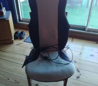La bande élastique permettant la fixation sur un siège est détendue. Comment ça marche : - On installe le fauteuil sur une chaise ou un fauteuil, - On le branche sur 220 V, - U
