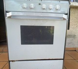 Cuisinière électrique Scholtes 4 feux fonctionnels. Le four contient une grille et une plaque de cuisson. Dimensions : h 86cm, largeur 59.6 cm, profondeur 60 cm. Cuisinière stocké