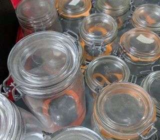 Lot de bocaux en verre avec couvercle à fermeture mécanique et joint orange, visibles sur la photo. Les bocaux semblent propres et tous équipés de leur joint. Tous les bocaux sont