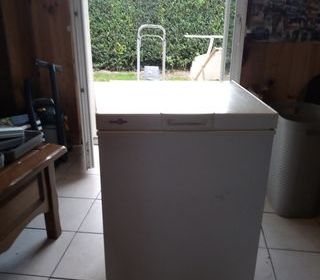 Congélateur coffre de couleur blanche avec ouverture par le dessus. L'appareil est visible fermé sur la photo, sans accessoires ou éléments additionnels apparents.Vend congélateur