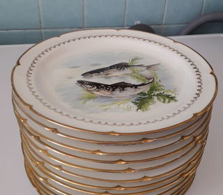 12 Assiettes fantaisies représentant différends poissons. Porcelaine fine, fabriquée à Vierzon, liseré doré. TBE