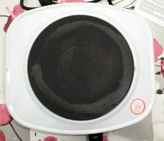 marque Bruner, 750w, corps métal verni blanc, bouton sélection puissance, dimensions 28 x26 x h 7, possibilité en camping grâce a sa puissance réduite