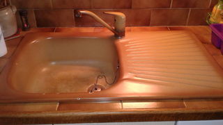 Achète évier un bac marron flammé encastrable, environ 830mm x480 mm, occasion bon état ou neuf.