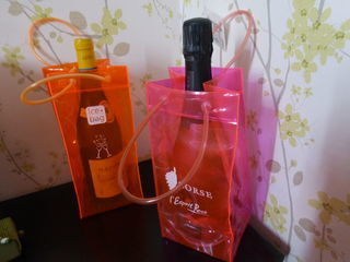 ajoutez de l'eau, des glaçons dans le SAC RAFRAICHISSEUR DE BOUTEILLE transparent, coloré vif, avec anse pour toutes bouteilles ! PVC souple, se plie : ORANGE "ice bag" ROS
