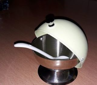 petit SUCRIER BOULE BISTROT . inox . avec couvercle vert et un bouton pour soulever. Idéal pour le sucre en poudre. H 9 cm diamètre dessus 8.5 cm et la petite cuillère blanche