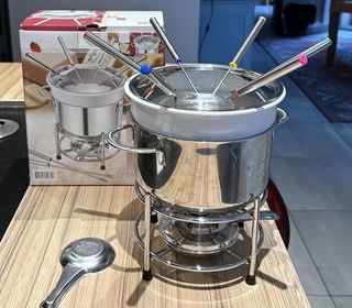 Service à fondue 2 caquelons, idéal pour fondue viande, poisson ou aux légumes ainsi que pour la fondue au fromage et également la fondue au chocolat. Servi 1 fois, en très bon é