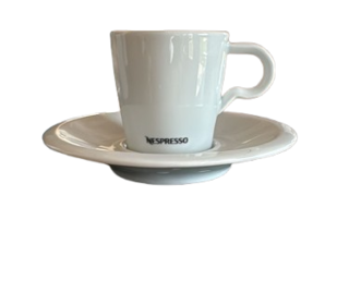 Lot de 10 tasses à café Nespresso d'origine, avec leurs soucoupes assorties. Modèle en porcelaine blanche avec logo Nespresso, au design sobre et élégant, idéal pour espresso et ca