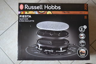 Appareil à Raclette Russell-Hobbs Fista - Quator 8 Pan Raclette avec Pierrade - ( 8 Convives) 220v/Puissance:1200w Efficacité énergétique =EC210 (inwh/kg) Règlement Européen