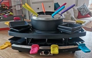 la plaque de grill est abimée, voir foto appareil à raclette, fondue et grill pour 6 à 8 personnes le bol fondu et ,piques n'ont jamais été utilisés 8 caquelons / poêlons et 6 p