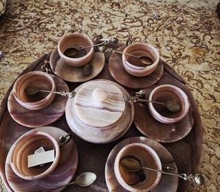 Je vends un beau service à café en Onyx. 6 tasses et sous-tasses, 6 petites cuillères, un sucrier et un plateau (Onyx aussi). Bon érat, n'a jamais servi.