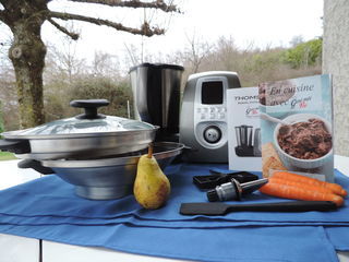 Robot cuiseur Thomson accompagné de son panier cuiseur, différentes fonctions : cuisson, hachage avec livre recettes