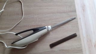 Couteau électrique : - Marque : SEB - Longueur : 27 cm - Lames : 21 cm - Bouton poussoir pour éjecter les lames - en bon état Laisser message si appel téléphonique.
