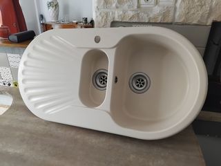 évier cuisine. long 97 cm. large 49 cm profondeur 20 cm. trou robinet 35 mm.couleur champagne. matiere composite. tres bon état. 2 bacs