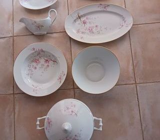 Vends un ensemble de sept pièces comprenant deux ramiers ovale de 24 cm de diamètre une saucière de18 cm de long un saladier de 24,5 cm de diamètre un plat de service ovale de 38 c