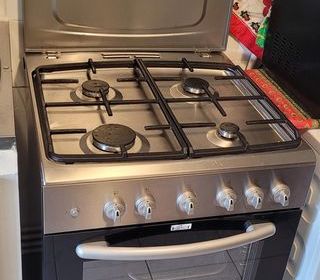 Cuisinière en inox comprenant quatre plaques de cuisson à gaz sur le dessus et un four avec porte vitrée en dessous. Le couvercle en métal est relevé. Plusieurs boutons de commande