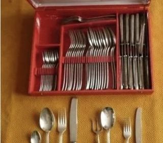 MENAGERE de 55 couverts, métal argenté dans son écrin d'origine dim. long. 38 cm, larg. 28 cm, haut. 6,5 cm, composée de : - 12 cuillères (long. 21,5 cm,80 gr la cuillère) - 12 fou