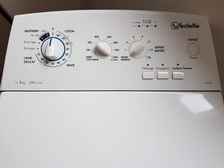 Lave-linge VEDETTE VLT5100W ? Lave-linge en pose libre ? Chargement par le dessus (top) ? Capacité de 5 kg ? Vitesse d'essorage max de 1000 tr/min ? Confort : Démarrage différ