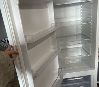 Réfrigérateur blanc avec plusieurs balconnets de porte, trois clayettes amovibles et trois tiroirs dans la partie inférieure. L'appareil est propre et vide, porte ouverte.