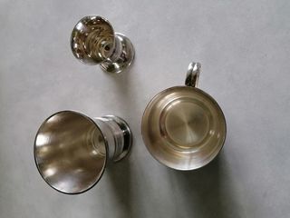 Ensemble métal argenté : timbale (décor étoile) soucoupe (décor lapin) coquetier à rayures Prix 10 €